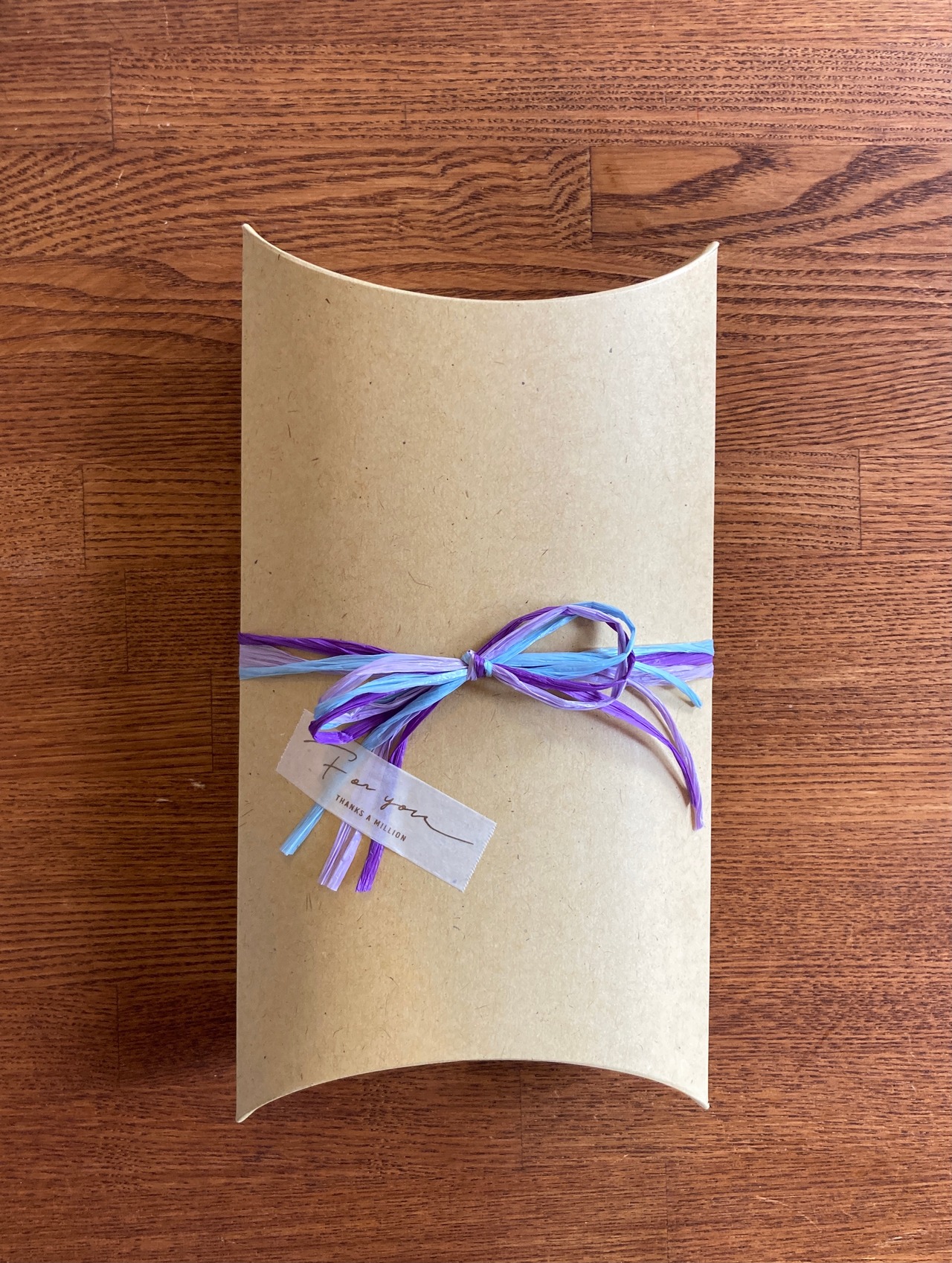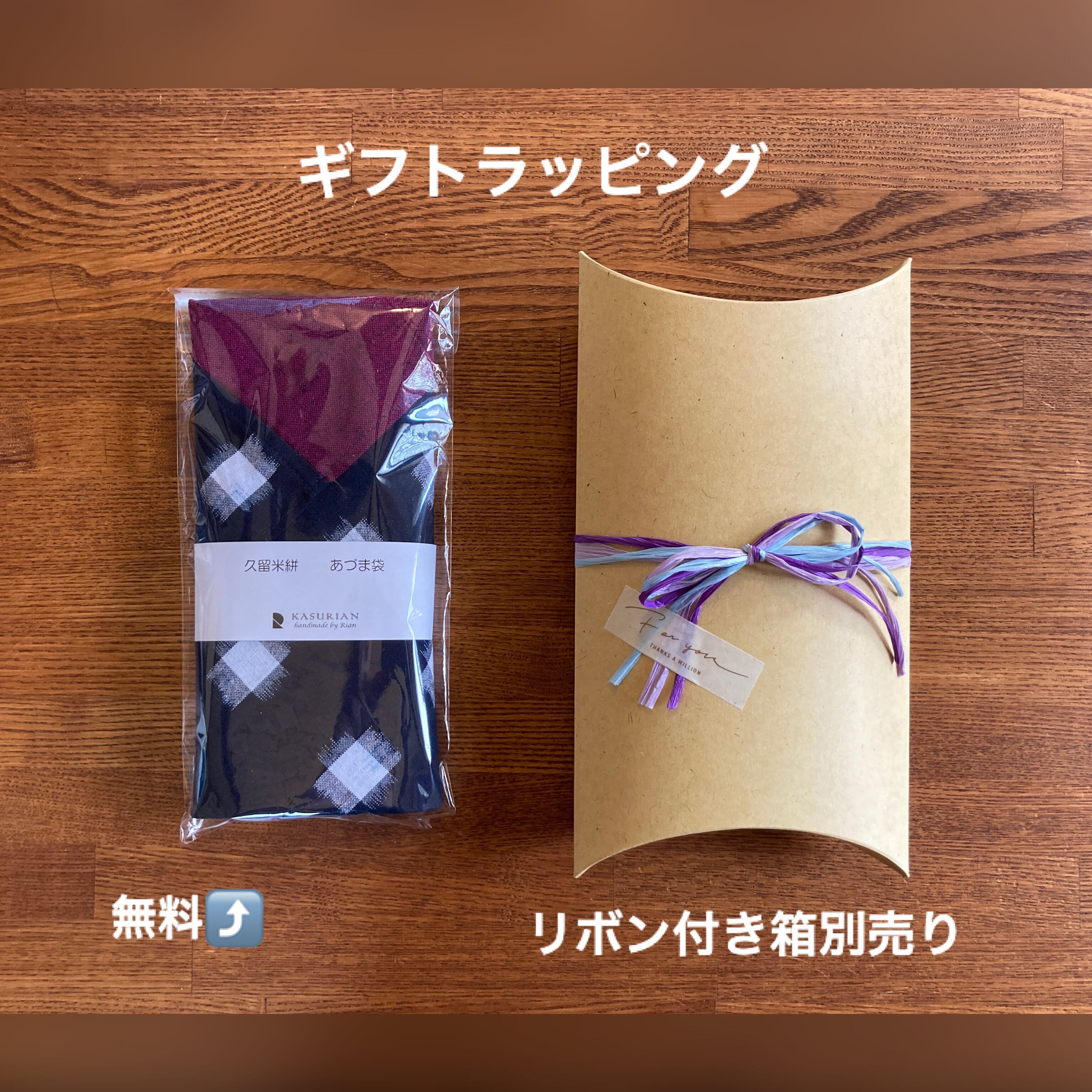 久留米絣あづま袋用の、ギフトラッピングです。 クラフト紙の箱に、ペーパーリボン、シールをあしらった可愛いラッピング。 リボンをかけた状態で、あづま袋と同梱させていただきます。