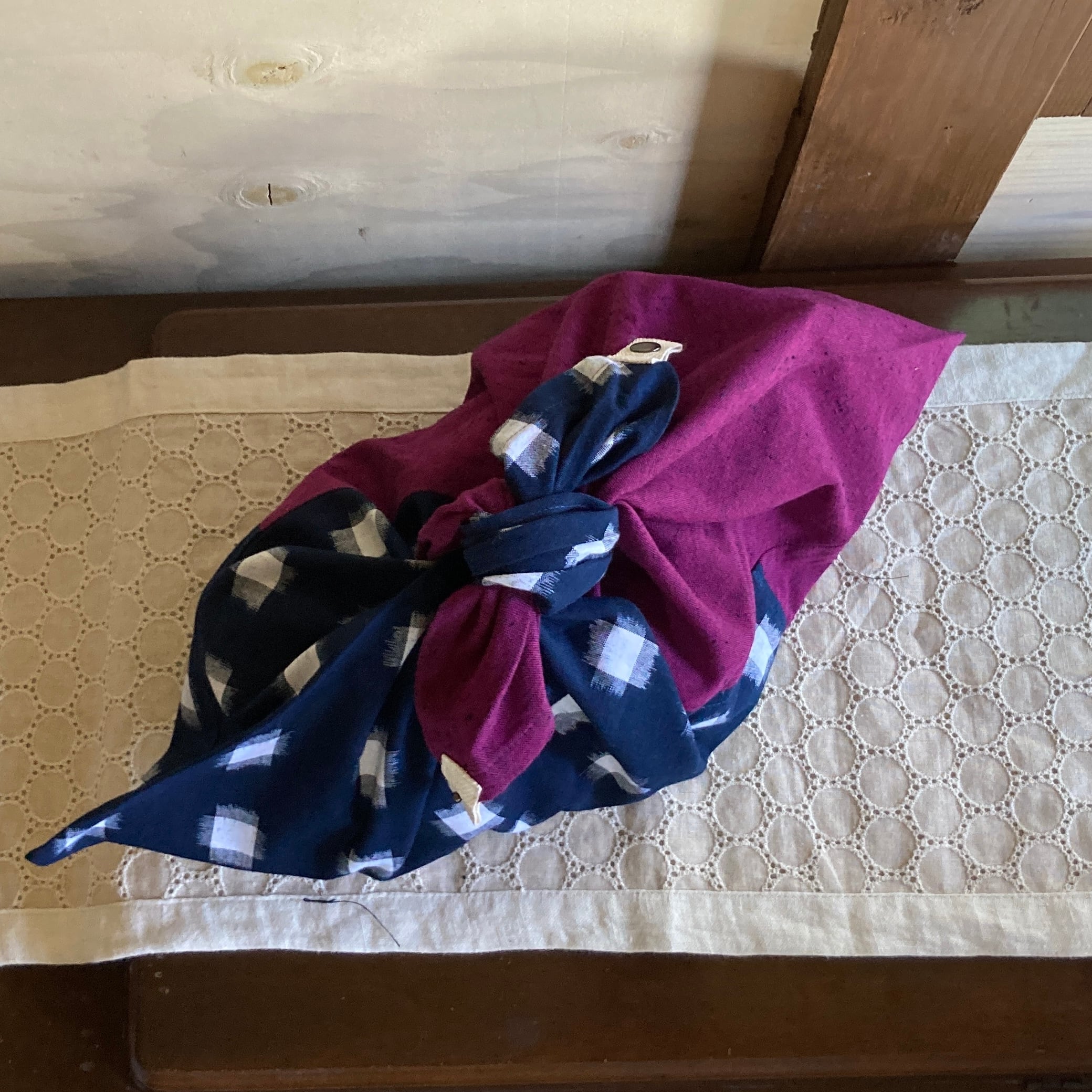 久留米絣の柄と、無地を縫い合わせてあづま袋を作りました。