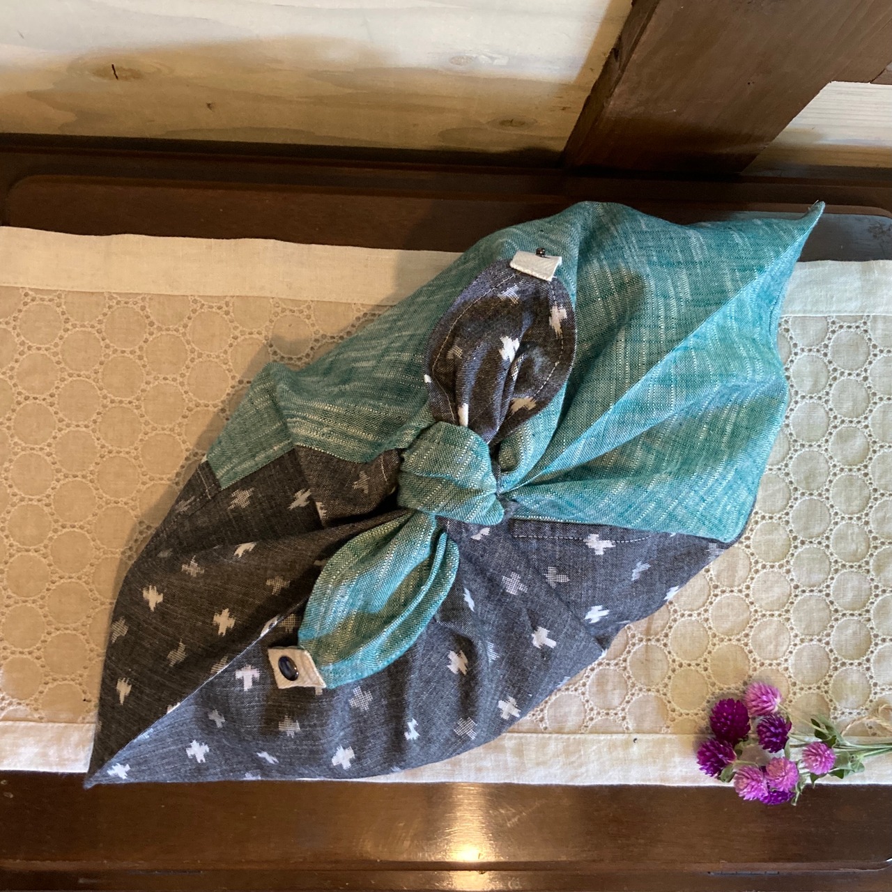 ②ホックをとめず、先を結んで、手で待ってもあづま袋らしい可愛らしいデザインです。