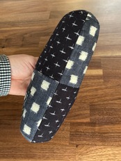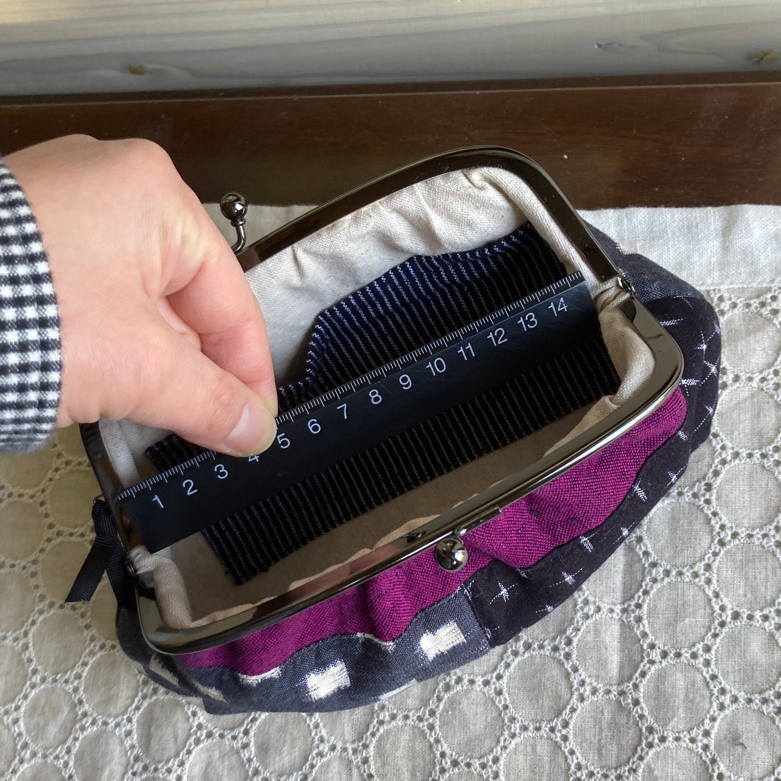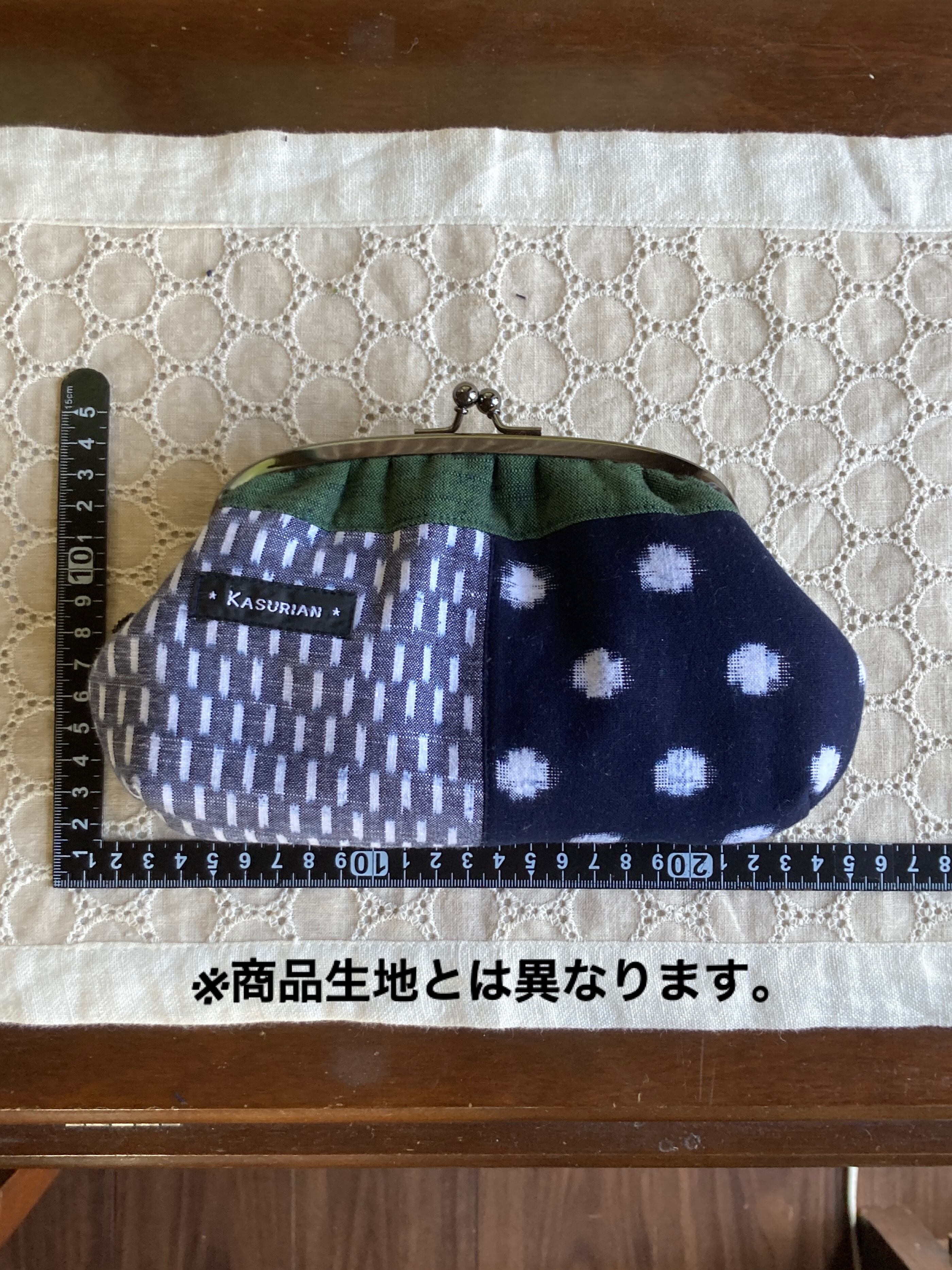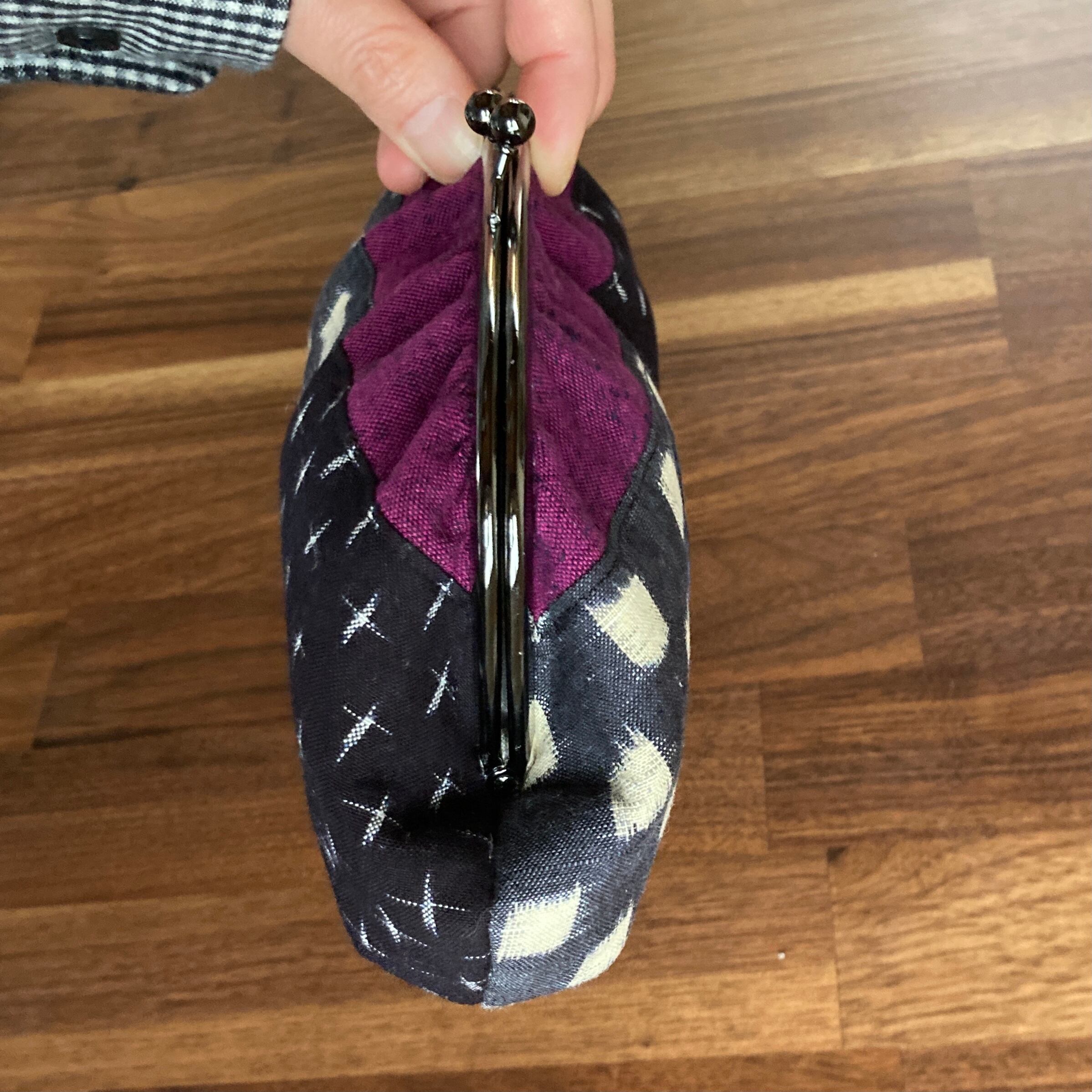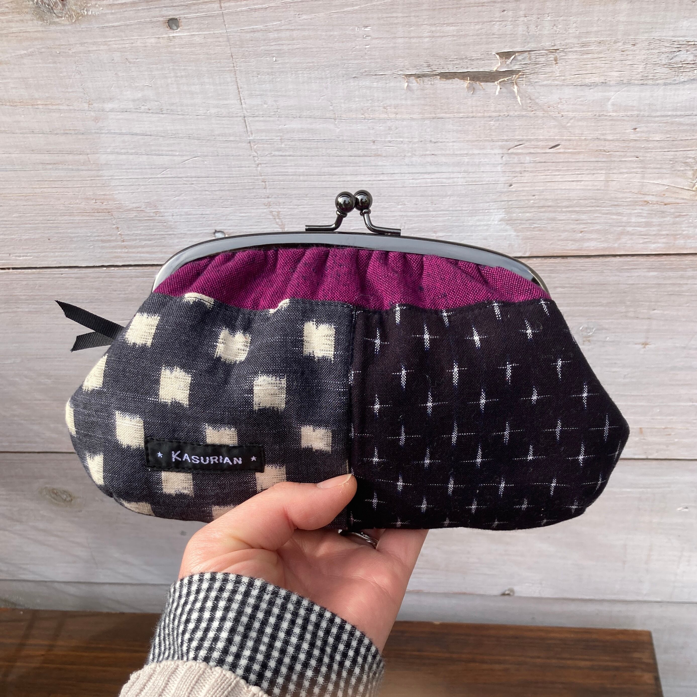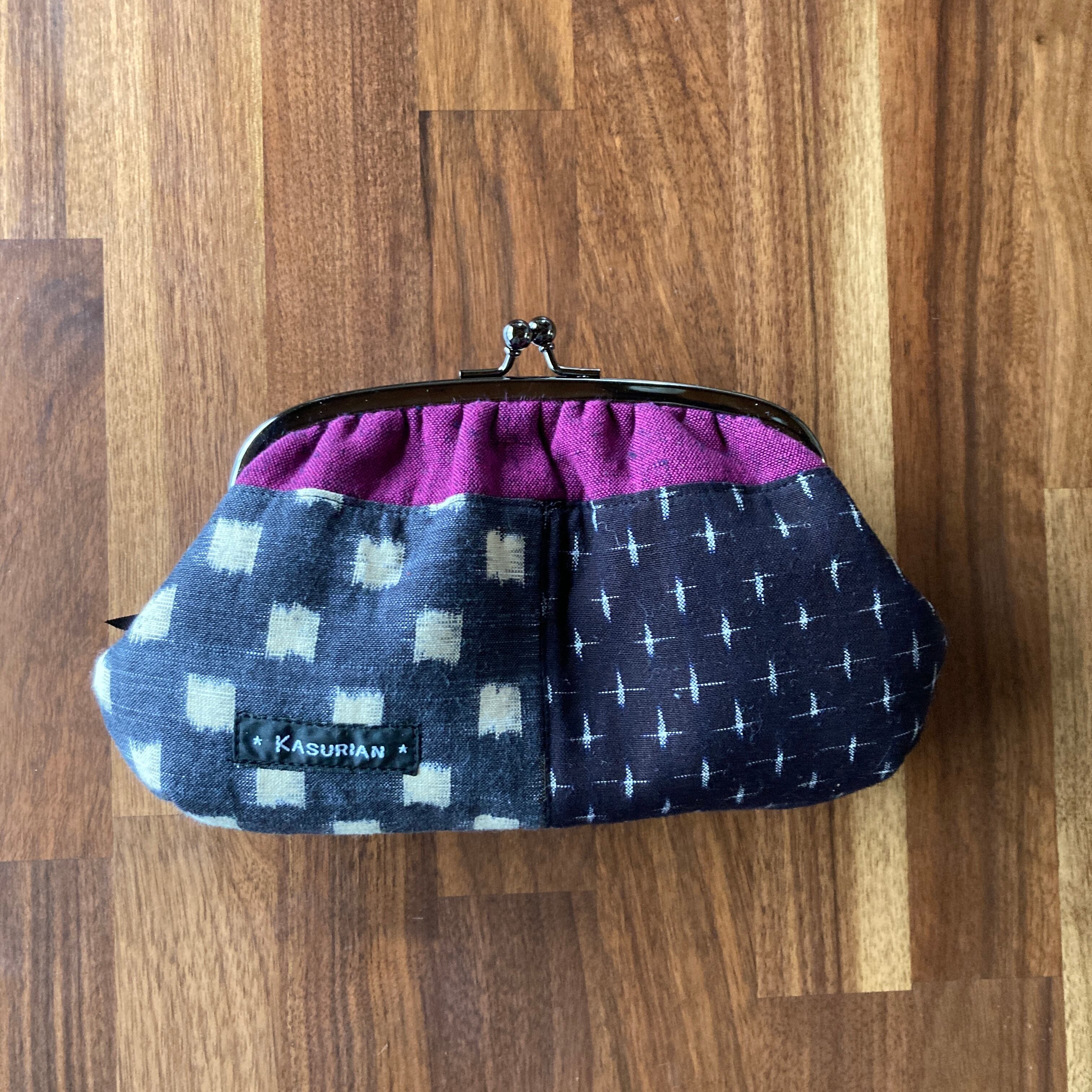 久留米絣の生地を縫い合わせて、ギャザーたっぷりの、ぷっくりとした形のがま口ポーチを作りました。