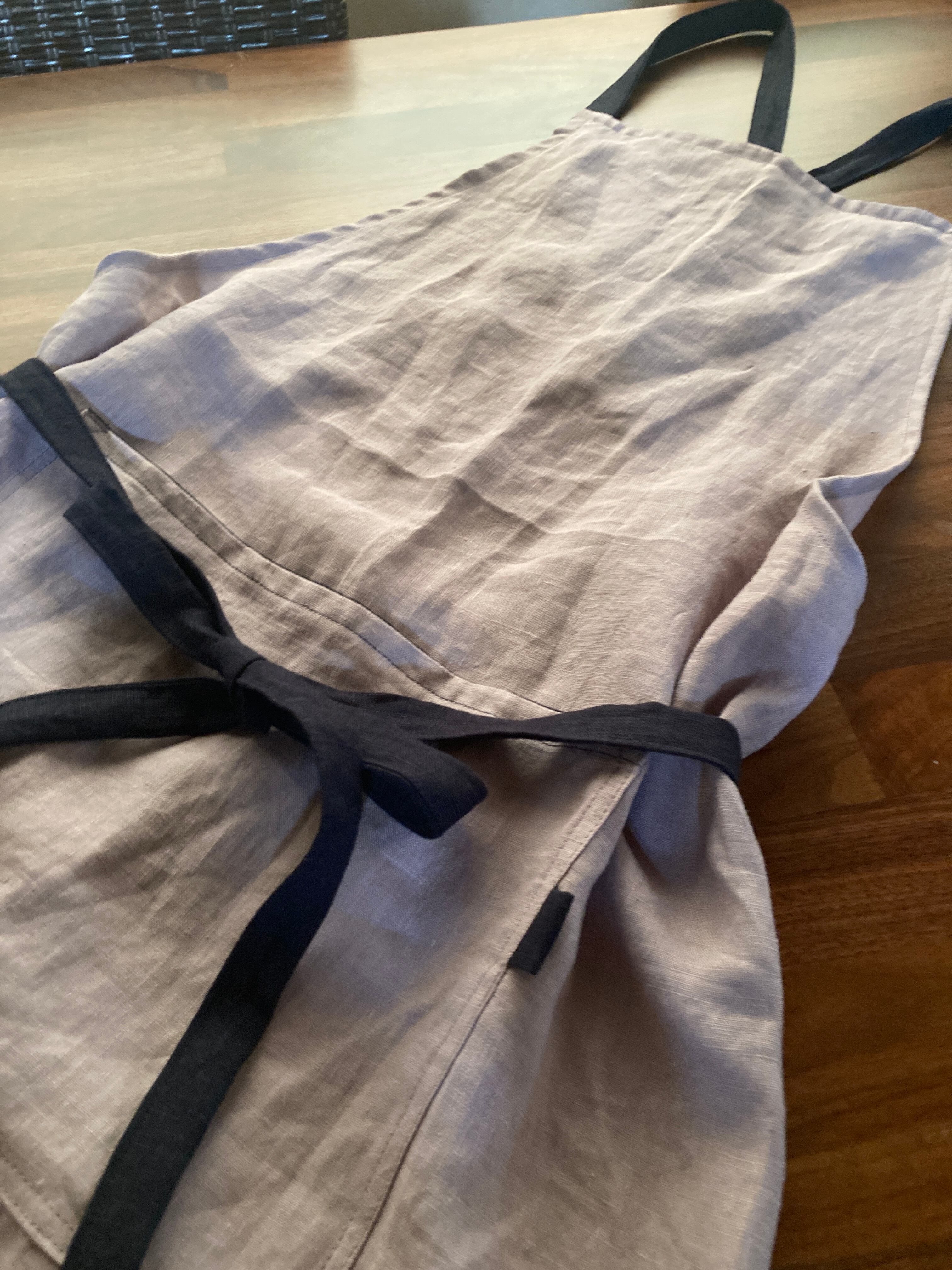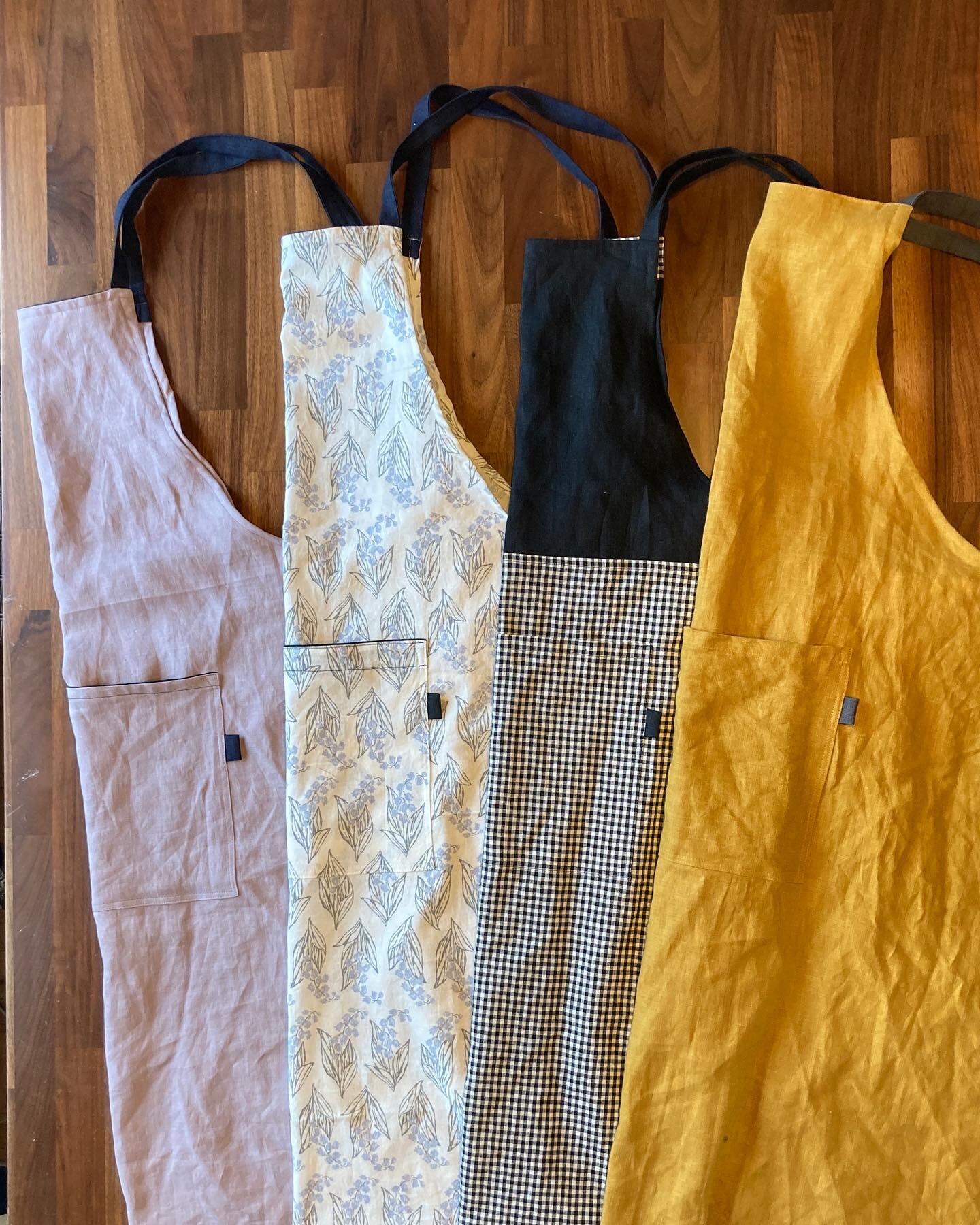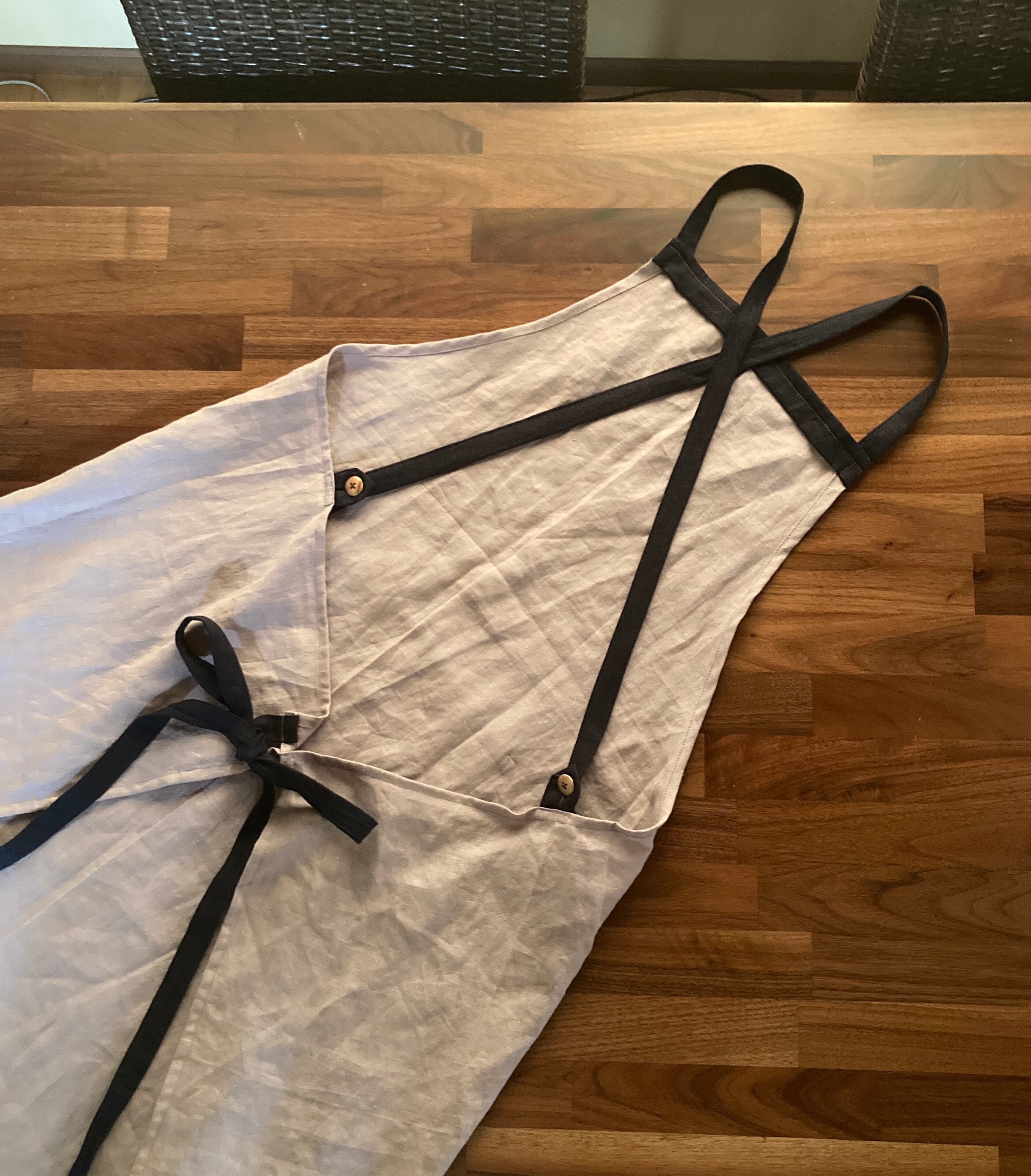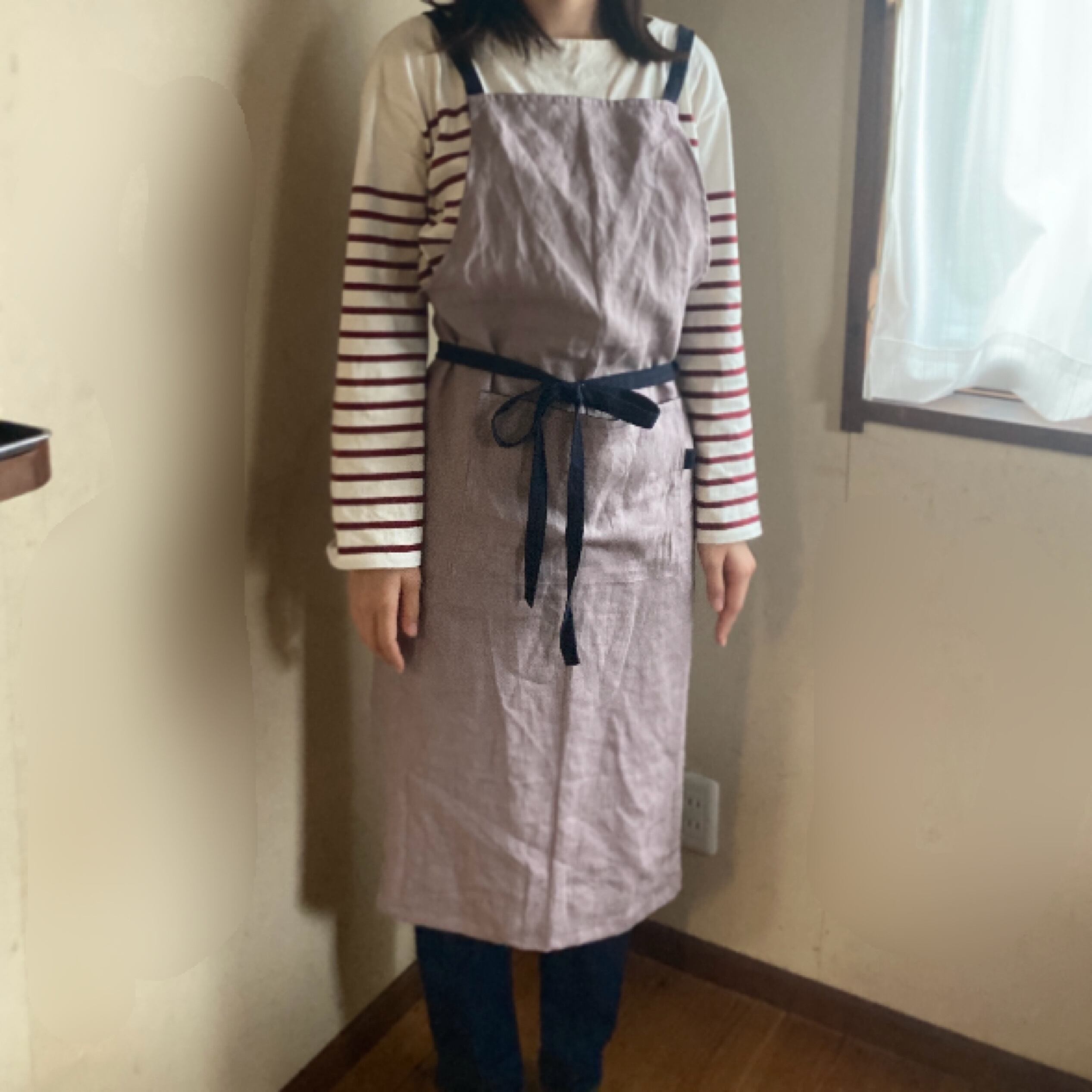天然素材のリネン100パーセントの生地で作りましたこちらのエプロンは、リネンの特性上、通気性があり、軽くて柔らかく、耐久性にも優れています。また、肩紐を背中でクロスするタイプなので、長時間着用してもストレスを感じません。